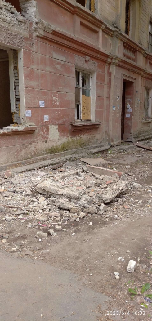 Мало того, что просто противно и жутко проходить мимо них, да ещё и опасно. Особенно мимо дома 160. Возле него очень узкий тротуар, который усыпан битым стеклом, кусками штукатурки, битым кирпичом, домашним хламом. За прошедшие несколько месяцев люди протоптали в этом хламе дорожку, шириной в метр, и так ходят каждый день. Сверху угрожающе нависают остатки балконов, несколько балконов (с торца дома и с поперечной улицы) уже рухнули на землю. Нет никакой гарантии, что в одночасье кирпич не упадет на голову. Однозначно, люди ходят мимо этого дома с риском для жизни. Мамочки с колясками гуляют.