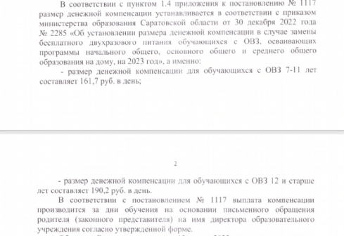 Получен ответ от Овсянникова С.А., в котором содержится информация, что обучающимся с ОВЗ на дому выплаты 161, 7 рублей в день, а учащимся без ОВЗ просто детям-инвалидам и нуждающимся в длительном лечении -62,73 рублей в месяц.