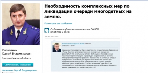 Ликвидация очереди многодетных семей на землю. Прокуратуру просят провести проверку :: Новости Саратова :: сайт «Лица Саратовской губернии» (lizagubernii.ru) 22.03. 2022 Ответ от 21.04.2022 за подписью ГолубеваИ.П.(суть ответа не раскрыта).