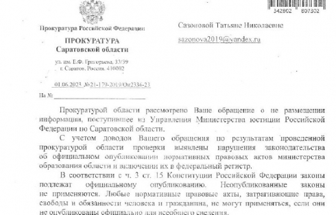 Получен ответ от 1 июня 2023 года прокурора Калигина М.Б. на моё обращение, переданное в прокуратуру из Управления минюста области о том, что выявлены нарушения при публикации приказов минобра 1595 и 2285.