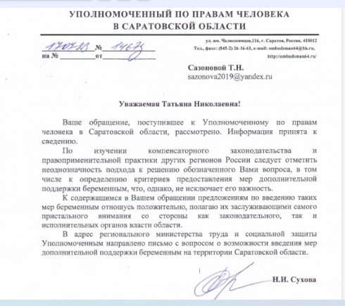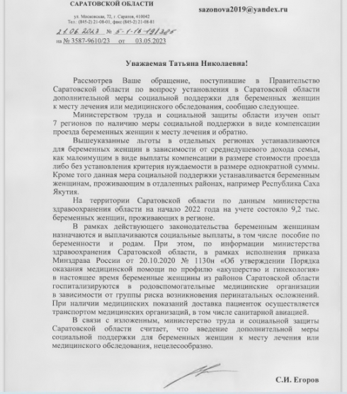 Спасибо Вам за поддержку инициативы по введению мер доподдержки беременных по компенсации проезда на консультирование и после родоразрешения, хотя Егоров С.И. посчитал её нецелесообразной, основываясь на ответах Костина О.Н. (ответ за подписью Егорова С.И. прилагаю от 21 июня июня 2023 года).