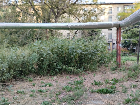 Траву на площадке скосили. А рядом с площадкой -- нет. Она уже выросла выше 3-х метров: циклахена и конопля. Земля, как я понимаю, муниципальная.
