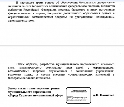 ЗАЩИТИТЕ , ПОЖАЛУЙСТА, ПРАВА ДЕТЕЙ С ОВЗ, ОБУЧАЮЩИХСЯ В ДОШКОЛЬНЫХ ОБРАЗОВАТЕЛЬНЫХ УЧРЕЖДЕНИЯХ САРАТОВА на получение 2-разового бесплатного питания, гарантированного ст.79 ФЗ 273 "Об образовании".