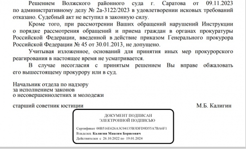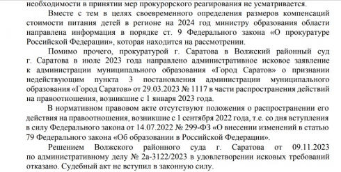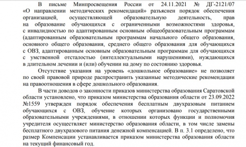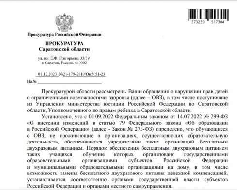 Проверьте, пожалуйста, компетентность Калигина М.Б.Проверьте, пожалуйста, знает ли он, что :1. ст. 79 ФЗ 273 "Об образовании" касается всех ступеней образования, в том числе и дошкольного. Уверяет, ссылаясь не на ключевые НПА , а на письма минпросвещения, не относящиеся к дошкольникам с ОВЗ, что не положена компенсация питания дошкольникам с ОВЗ, обучающимся в дошкольных образовательных учреждениях как очно, так и на дому. Содержание пункта 3 статьи 12 ФЗ 273 Калигину М.Б. известно?;2.минобр области издал приказ 1559 от 23.09.2022, который не охватывает дошкольников с ОВЗ. Минобр областиутверждает, что так как дошкольных учреждений нет ему подведомственных, то и охватывать дошкольников не нужно.Но минобр является плательщиком компенсации за обучение детям -инвалидам, получающих образование на дому дошкольное и размер компенсации должен быть указан, так как постановление Правительства Саратовской области от 28.08.2013 № 439-П действующее на данный момент времени;3. обнародованным считается приказ, который опубликован на сайте электронного периодического издания «Новости Саратовской губернии» (http://g-64.ru/) ", а не просто загруженный на сайт минобра приказ № 2285 30 декабря 2022 года, вместо 31 августа 2022, а опубликованный лишь 30 мая 2023 года.Но ни в отношении минобра прокуратура дел об административных правонарушениях по основаниям ст 5.63 КоАп РФ не возбуждала, а почему?;4. иск составили в прокуратуре г Саратова о бездействии мэрии Саратова в части компенсации питания с 1 сентября 2022 по 31 декабря 2022 года, судья Магазенко Ю.Ф. его отклонил. Будет ли прокуратура города Саратова его обжаловать? Решение вынесено 9 ноября 2023 года, срок обжалования 1 месяц. Не опаздает ли прокуратура Саратова с подачей апелляции?5. дети-инвалиды в Саратовской области, обучающиеся по дошкольным программам на дому согласно постановлению Правительства Саратовской области от 28.08.2013 № 439-П не обучаются на семейной форме. На дому они обучаются.На дому.Это другая форма обучения согласно ст .17 ФЗ 273 . Для семейной формы не нужно никаких заключений врачебных комиссий медучреждений. Так вот у детей -инвалидов, обучающихся на дому согласно постановлению Правительства Саратовской области от 28.08.2013 № 439-П отсутствуют Договора с минобром, не обеспечивается выплата компенсации за питание по ст. 79 ФЗ 273, хотя от них требуют согласно Админрегламента медзаключения для обучения на дому и после исполнения 7, 5 лет заключения ЦПМПК. Понимает ли Калигин М.Б. различия между формами образования или другая причина его бездействия при ответах не по существу на наши обращения?6. прокуратура может подать иск в интересах ребёнка -инвалида по конкретному обращению его родителя , почему же Калигин М.Б. считает что мер прокурорского реагирования принимать не нужно из-за неисполнения положений ст. 79 ФЗ 273, сами подали граждане 2 иска в районные суды.