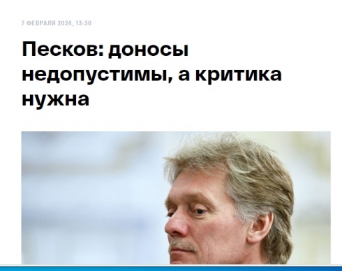 "Практика доносительства — это "плохо", а критика — полезное для общества явление. Об этом заявил журналистам в среду пресс-секретарь президента РФ Дмитрий Песков, комментируя публичные призывы к запрету доносительства в стране."