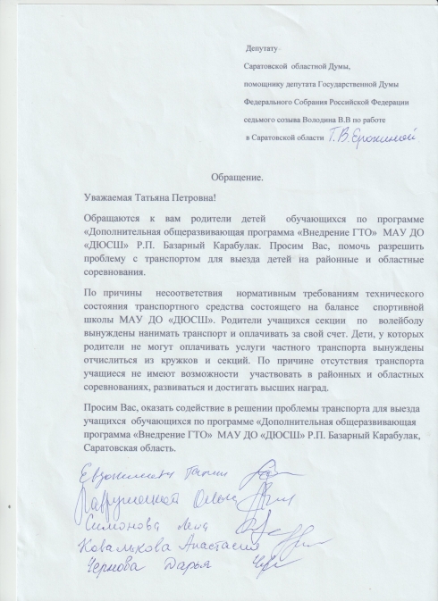 Обращаются к вам родители детей обучающихся по программе «Дополнительная общеразвивающая программа «Внедрение ГТО» МАУ ДО «ДЮСШ» Р.П. Базарный Карабулак. Просим Вас, помочь разрешить проблему с транспортом для выезда детей на районные и областные соревнования.
