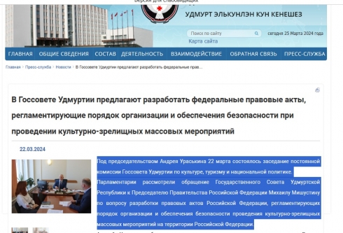 В Госсовете Удмуртии предлагают разработать федеральные правовые акты, регламентирующие порядок организации и обеспечения безопасности при проведении культурно-зрелищных массовых мероприятий (udmgossovet.ru)