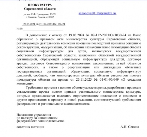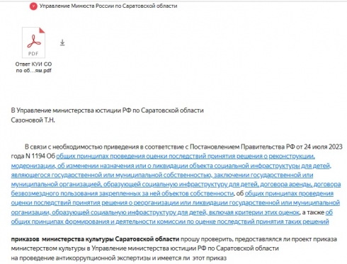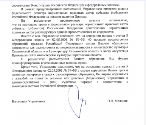 Спасибо Вам за проверку по моему обращению от 19 февраля 2024 года № 01-55-34 С наличия в федеральном регистре НПА субъекта РФ приказа министерства культуры по социальной инфраструктуре для детей и перенаправление 21 февраля 20024 года моего обращения 01-55-34 С от 19 февраля 2024 года в прокуратуру Саратовской области.