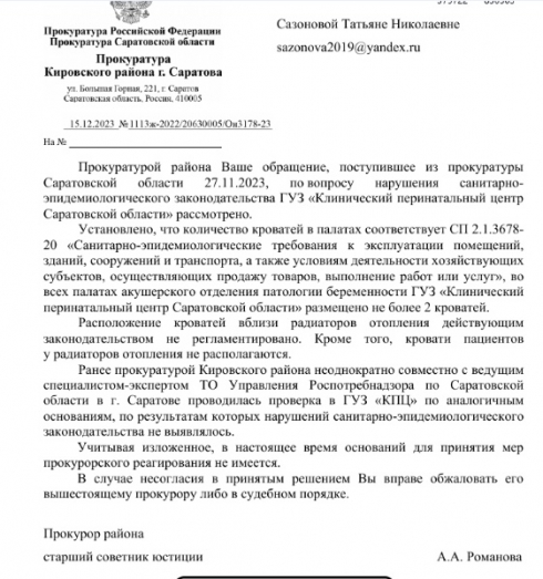 Спасибо за обращение в прокуратуру области по вопросу законности переоборудования 1-2 местных палата патологии беременных в 2-3 местные.