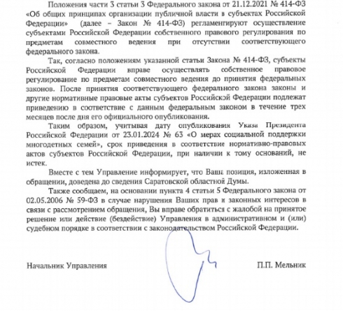 Вы довели до Саратовской областной Думы наше обращение к Вам от 29 января 2024 года и требования ФЗ 414 от 21.12.2021, ФЗ 63 от 23.01.2024.С уважением, Сазонова Т.Н.
