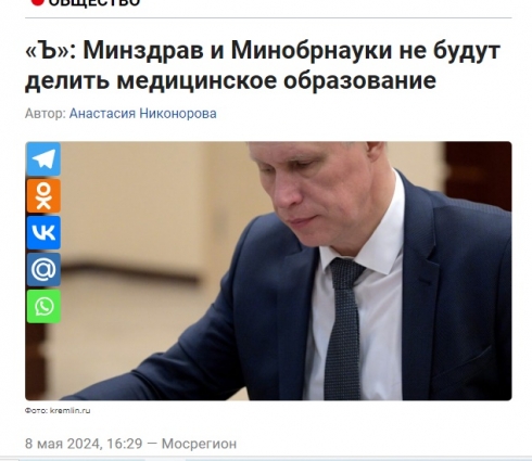 8 мая 2024, 16:29 — Мосрегион«Ъ»: Минздрав и Минобрнауки не будут делить медицинское образование - Вести Московского региона (mosregion.info)