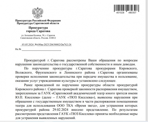 Моё обращение в СУ СКР по Саратовской области в феврале 2024 года о проверке легитимности использования государственной собственности ГАУК ТЮЗ было