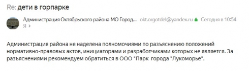 "Администрация района не наделена полномочиями по разъяснению положений нормативно-правовых актов, инициаторами и разработчиками которых не является. За разъяснениями рекомендуем обратиться в ООО "Парк города "Лукоморье"."