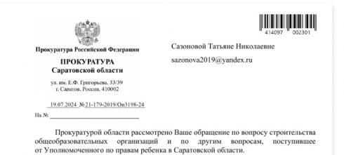 "Кроме того, прокуратурой г. Саратова в марте 2024 года в суд направлено административное исковое заявление о возложении обязанности на администрацию муниципального образования «Город Саратов» принять меры к разработке проектной документации для строительства общедоступного и бесплатного начального общего, основного общего, среднего общего образования по основным общеобразовательным программам посредством строительства общеобразовательных организаций в соответствии с существующей потребностью территорий, в том числе микрорайона «Солнечный-2», которое находится на рассмотрении.