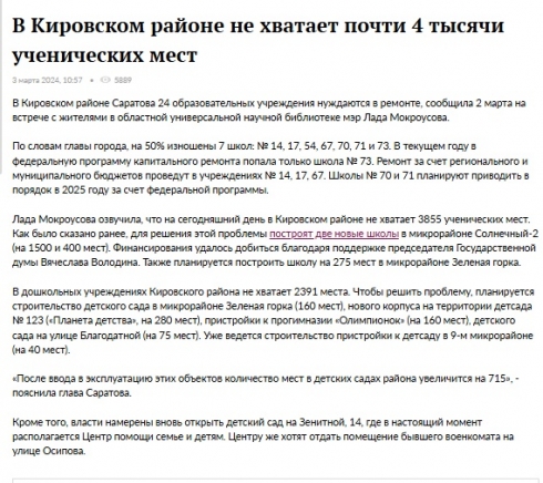 Власти города в марте 2024 года заявили о нехватке 3855 ученических мест. Судя по ответу Калигина М.Б. для решения этой проблемы построят две новые школы в микрорайоне Солнечный-2 (на 1500 и 825 мест). В Кировском районе не хватает почти 4 тысячи ученических мест — Регион 64 (sarnovosti.ru)