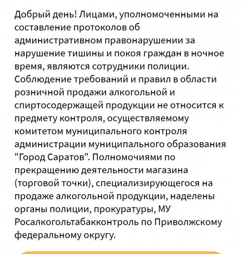 Здравствуйте! Региональным законодательством до 22.00 ограничен не режим работы питейных заведений, расположенных в многоквартирных домах, а реализация алкогольной продукции. В отдел полиции № 4 будет направлено обращение о необходимости проведения контрольных мероприятий относительно указанного объекта потребительского рынка с целью выявления и пресечения торговли алкоголем в ночной период времени. -- С уважением, администрация Ленинского района муниципального образования "Город Саратов"