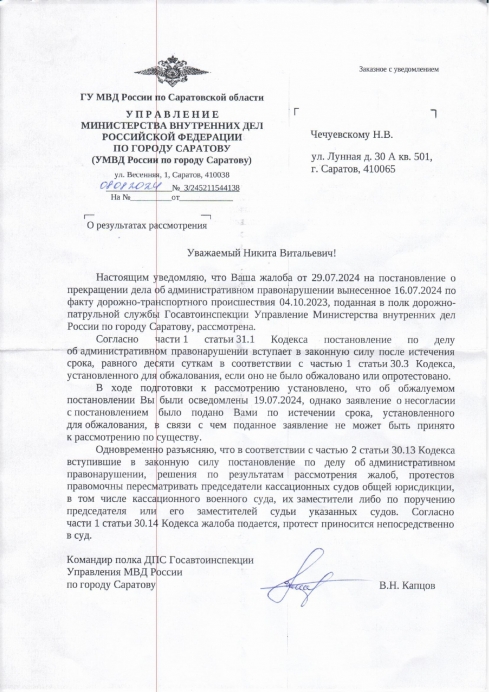 Уважаемый Павел Владимирович! 04.10.2023 произошло дтп с моим участием, в результате чего я получил травмы. Все это было установлено и зафиксировано в рамках административного расследования 1батальоном полка ДПС ГИБДД УМВД России по г. Саратову, проведено не менее двух экспертиз, однако по настоящее время виновный не определен, а дело об административном правонарушении прекращено! И это несмотря на то, что экспертом подтверждено причинение мне легкого вреда здоровью, а другим экспертом установлено, что у второго участника ДТП, водителя имелась техническая возможность предотвратить столкновение путем торможения, однако им была превышена допустимая скорость движения. Не согласившись с итогом проведенного административного расследования, полагая необходимость проведения дополнительной экспертизы, а также увидев, что выводы инспектора не соответствуют выводам эксперта, я обратился с жалобой на начальника полка ДПС. Постановление о прекращении мною было получено на руки 19.07.2024, жалобу я отправил почтой 29.07.2024, с учетом того, что 27 и 28 июля являлись выходными днями. Тем не менее, начальник полка ДПС не захотел рассматривать жалобу по существу, а отписался о том, что мною пропущен срок на обжалование! Считаю, что срок мною не пропущен, прошу оказать содействие либо прокоментировать приложенный отказ.