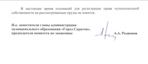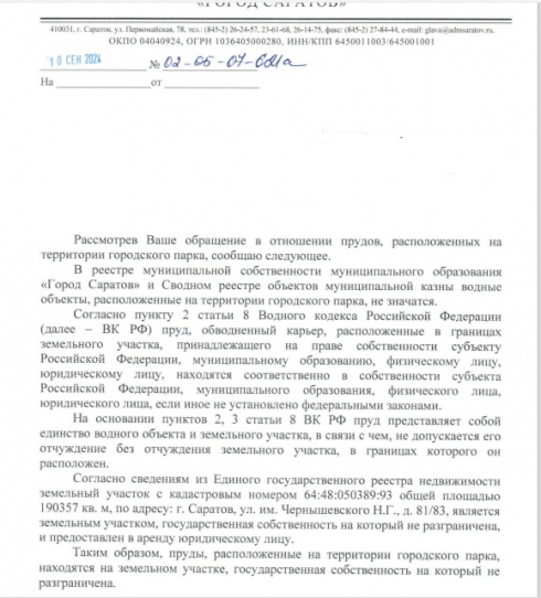 Исходя из ответа Родионова А.А. от 10 сентября 2024 года пруды горпарка расположены на земельном участке, государственная собственность на который не разграничена, поэтому администрация по его мнению не имеет правовых оснований вносить пруды в ГВР РФ.