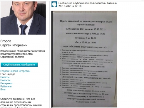 Берите пример с Суркова П.В., мы многократно обращались к Егорову С.И. из-за того, что для получения новогодних подарков родителям нужно каждый год ксерокопии снилсов, свидетельств о рождении и прочих документов привозить вместе с заявлением, хотя списки детей, которым полагаются подарки в минсоцтруда имеются.