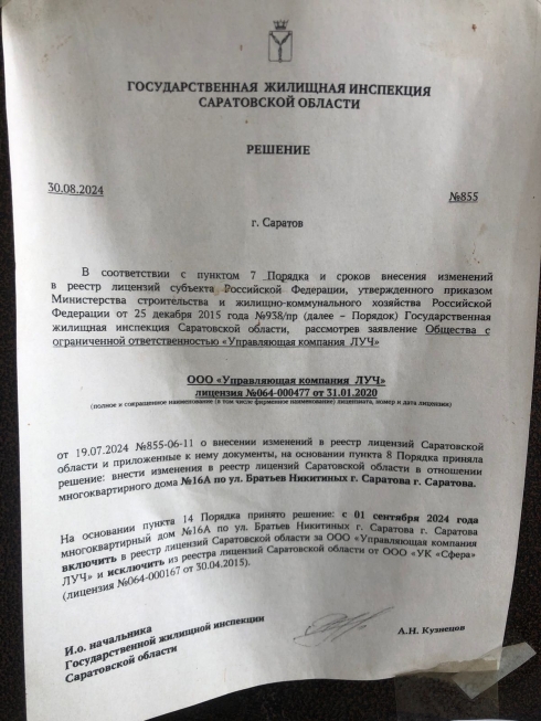 Уважаемый, Вячеслав Викторович! Добрый день!26.10.2024г. была в гостях с ребенком по адресу: г. Саратов, ул. Братьев Никитиных, №16 А, обратила внимание, что возле подъезда находятся не ступеньки, а поддоны! На что жильцы сказали, что Управляющая компания «Луч» сделала ремонт придомовой территории, а ступеньки не установили. Вечером в 20:00 этого дня выходила с ребенком и стала спускаться первая, у меня сразу проскочила нога в щель поддона, после чего я обратилась в Травмпункт, диагноз- закрытая травма КСА правого голеностопного сустава. Перелом медиальной лодыжки правой голени! Узнав у жильцов, сколько по времени у них проходит ремонт, они сказали, что все лето!!! У меня не было слов! А если бы это был ребенок!!! Безобразию нет предела!! Думаю, что я не первый случай получившая травмы на данной территории! Очень прошу разобраться в этой ситуации! Т.к. могут пострадать не только взрослые, но и дети! О возмещении морального ущерба, уже не говориться….осталась на долгом больничном! Для достоверности о случившемся, оставляю свой номер телефона: 8(937)968-61-14 Надежда только на Вас!