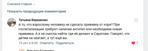 "А то, что взрослому человеку не сделать прививку от кори? При госпитализации требуют наличие антител или необходима новая прививка. А я не смогла найти, где её делают в Саратове. Говорят, что детям не хватает, а тут ещё вы."