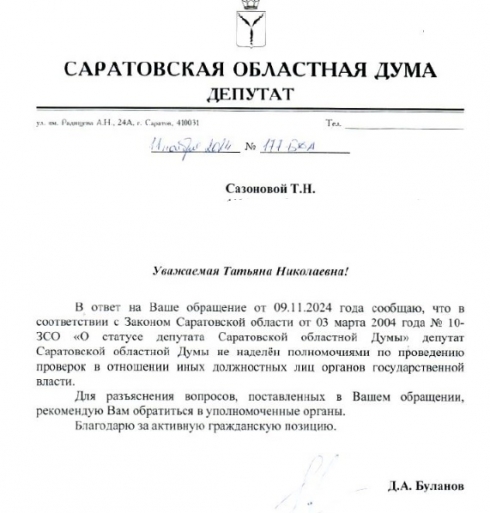 Обращались к депутатам Саратовской областной Думы Грибову Р.В., Литневской Ю.М., Анидалову А.А.,Буланову Д.А. , бывшему депутату Исаеву М.А.