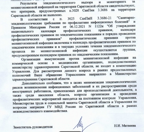 Однако, в ответе Матвеевой Н.М. не упоминается о 2 очагах менингококка в 2023 году, соответственно, мер принято по внесению вакцинации по ОМС Менактрой в Регкалендарь профпрививок Роспотребнадзором не было.