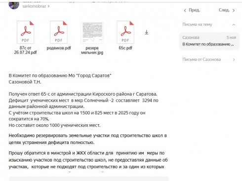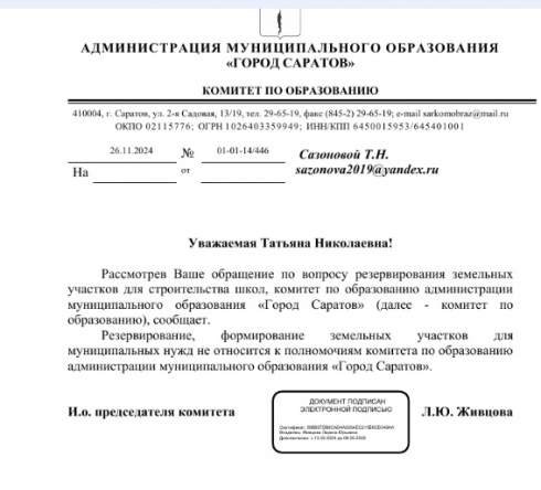 - В обращении от 5 ноября я просила Комитет по образованию МО "Город Саратов" обратится в минстрой и ЖКХ области для принятия ими меры по изысканию участков под строительство школ, не предоставляя данные об участках, которые не подходят под строительство и за один из которых судится администрация МО "Город Саратов"64:48:030101:32, 64:48:030101:2451, 64:48:030101:2453.