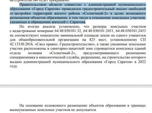 - Исходя из ответа прокурора Родвикова А.А. именно Правительством области совместно с администрацией муниципального образования «Город Саратов» для изыскания земельных участков должен проводиться градостроительный анализ свободной от застройки территорий жилого района «Солнечный-2» в целях возможного размещения объектов образования.