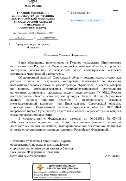 Мной делалось обращение к Вам по вопросу предотвращения ситуации с концертом Ениной и просьбой обратиться к Губернатору Бусаргину Р.В. предпринять действия по мониторингу соблюдения положений ФЗ 436: проверке возрастного ценза на концертных площадках области, в том числе и частных.