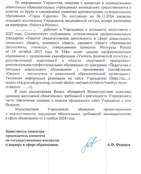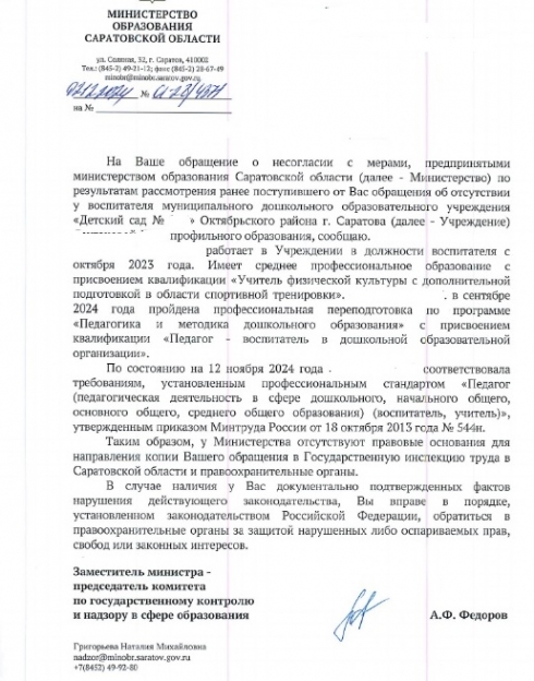 Будучи замминистра-Председателем Комитета по по государственному контролю и надзору в сфере образования Фёдоров А.Ф. жалобу на его ответ от 12 ноября 2024 года о проверке возможных нарушений трудового законодательства в одном из ДОУ Саратова рассмотрел сам. Не нарушил ли он положения ФЗ 59, не должен ли был жалобу на его ответ передать Вам как министру образования области?