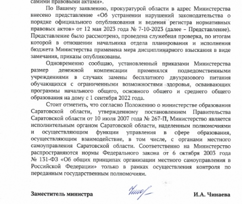 - Также прошу не допустить повторения ситуации 2022 года: приказ до наступления 2023 финансового года принят и опубликован не был, приказ от 30 декабря 2022 был опубликован только 30 мая 2023 года Приказ министерства образования Саратовской области от 30 декабря 2022 года № 2285 — документы Саратовской области.