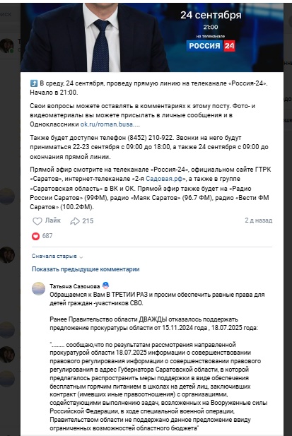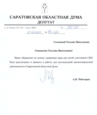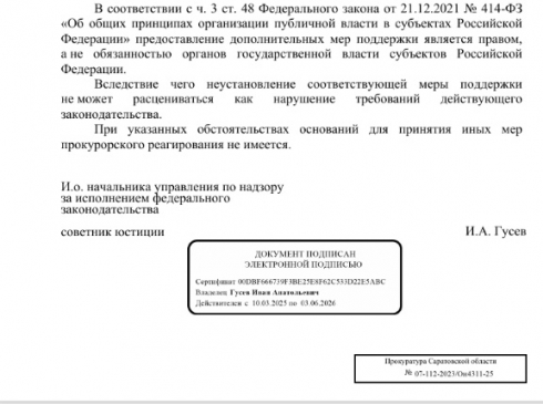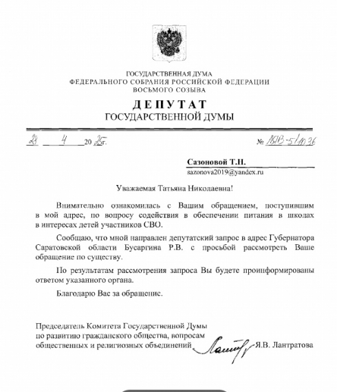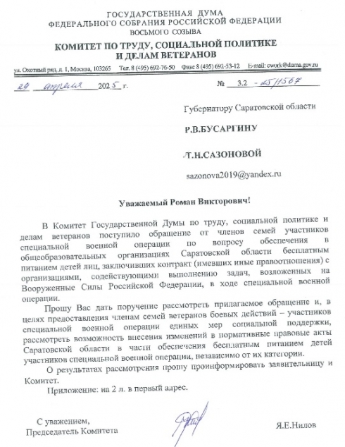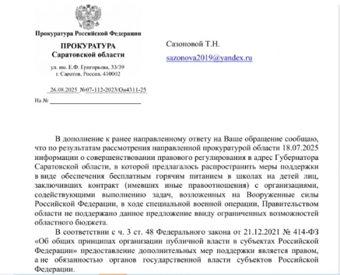 - "........ сообщаю,что по результатам рассмотрения направленной прокуратурой области 18.07.2025 информации о совершенствовании правового регулирования в адрес Губернатора Саратовской области, в которой предлагалось распространить меры поддержки в виде обеспечения бесплатным горячим питанием в школах на детей лиц, заключивших контракт (имевших иные правоотношения) с организациями, содействующими выполнению задач, возложенных на Вооруженные силы Российской Федерации, в ходе специальной военной операции, Правительством области не поддержано данное предложение ввиду ограниченных возможностей областного бюджета"