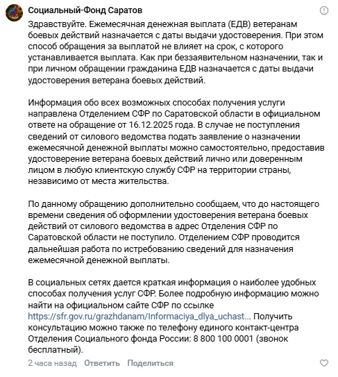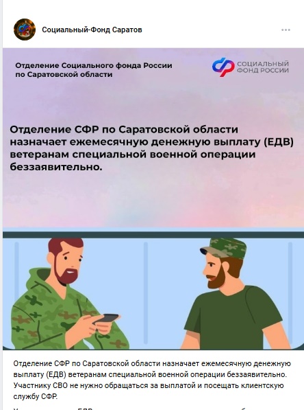 Обяжите сотрудников отделения СФР по Саратовской области, пожалуйста, сообщать полную информацию о порядке назначения ЕДВ ветеранам боевых действий и не употреблять выражения "Участнику СВО не нужно обращаться за выплатой и посещать клиентскую службу СФР."