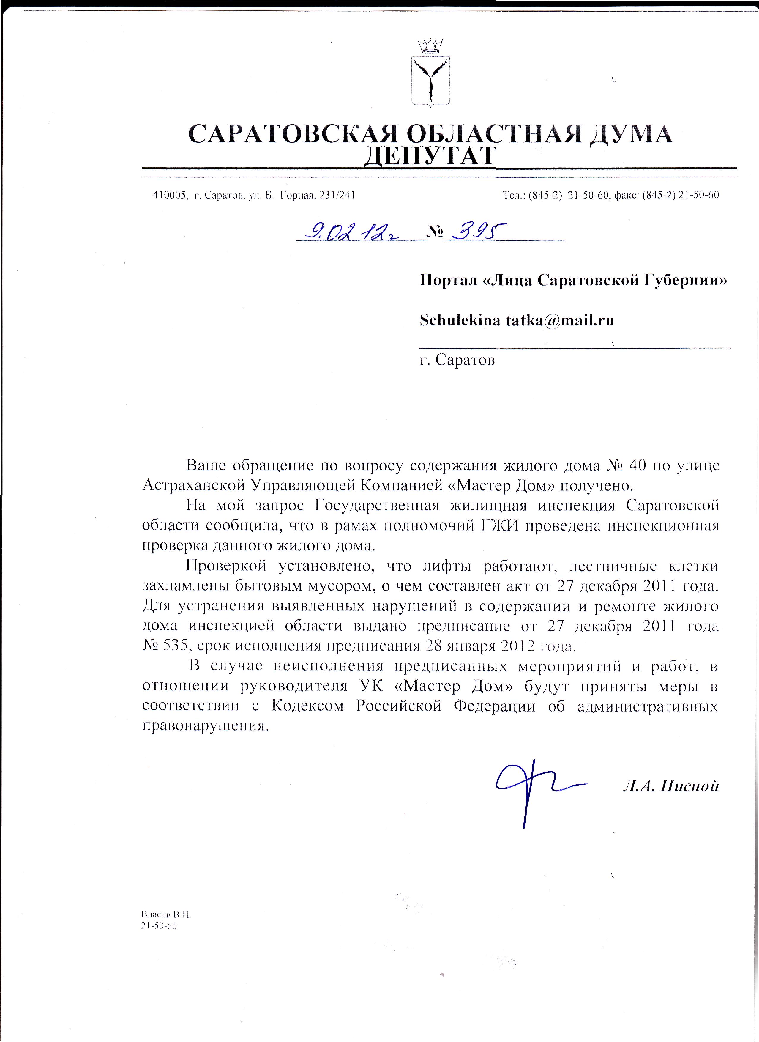 Уважаемый Леонид Александрович!Обращаюсь к Вам от лица жителей по адресу ул. Астраханская д.40.Дом обслуживается УК"Мастер Дом". Но сказать, что действительно обслуживается как оказалось нельзя разве что только по документам. Пробовала обращаться УК по вопросу санитарной уборки жилого фонда (за последние 2 месяца ни разу не проводилась уборка мусора в подъезде) на что получила ответ от заместителя ген. директора что не он этот мусор разбрасывает и вопрос не к УК. Хотя в перечне услуг и работ по содержанию общего имущества в многоквартирном доме, который был размещен на сайте УК одним из пунктов выделенным жирным шрифтом значится пункт санитарная уборка жилого фонда.Лифт не работает уже 2 месяца приходится ходить пешком или как вариант ездить до 7 этажа, а затем спускаться на 5.Помогите разобраться в данном вопросе. Заранее спасибо от всех жильцов дома!!! schulekina_tatka@mail.ru