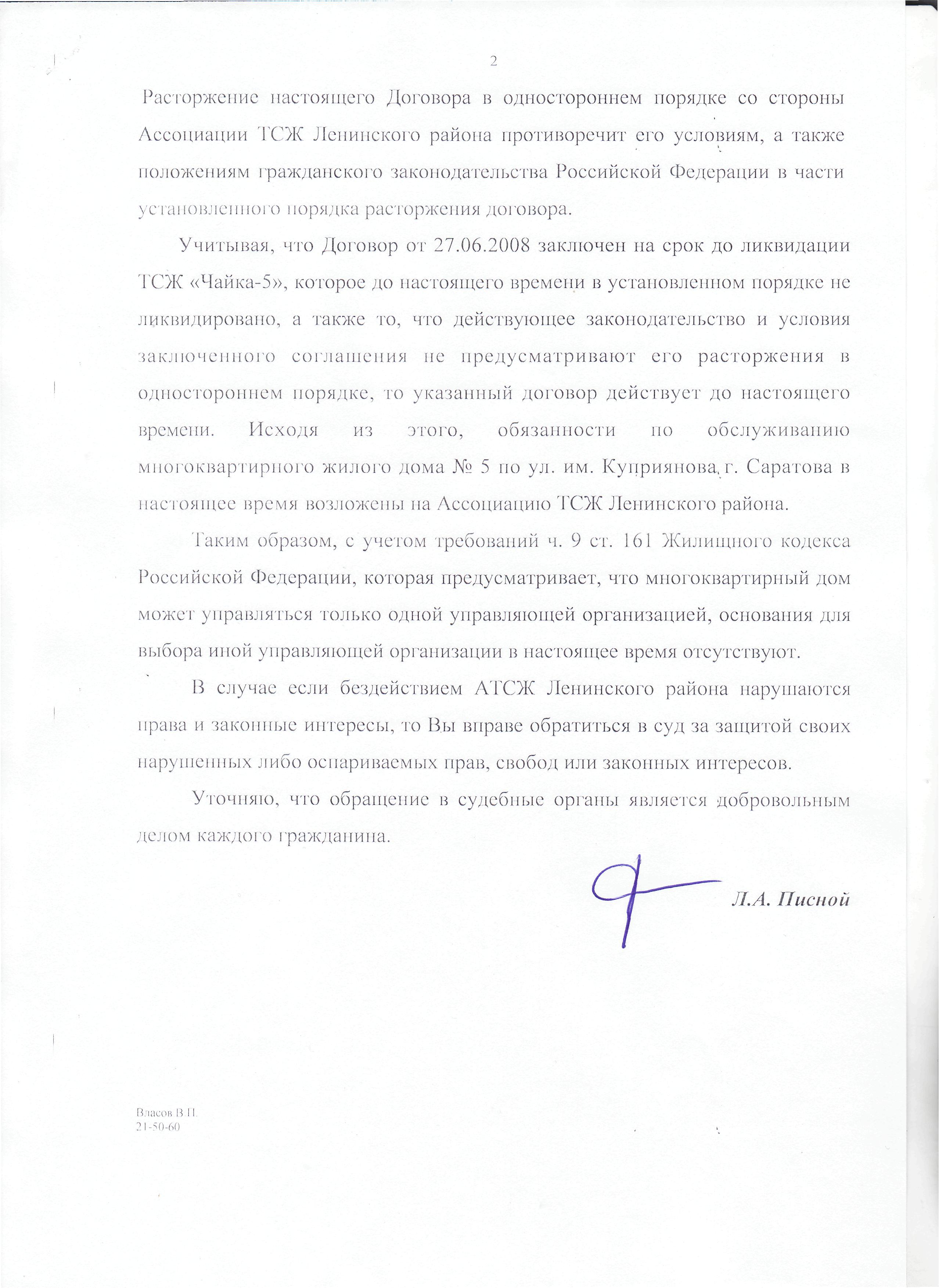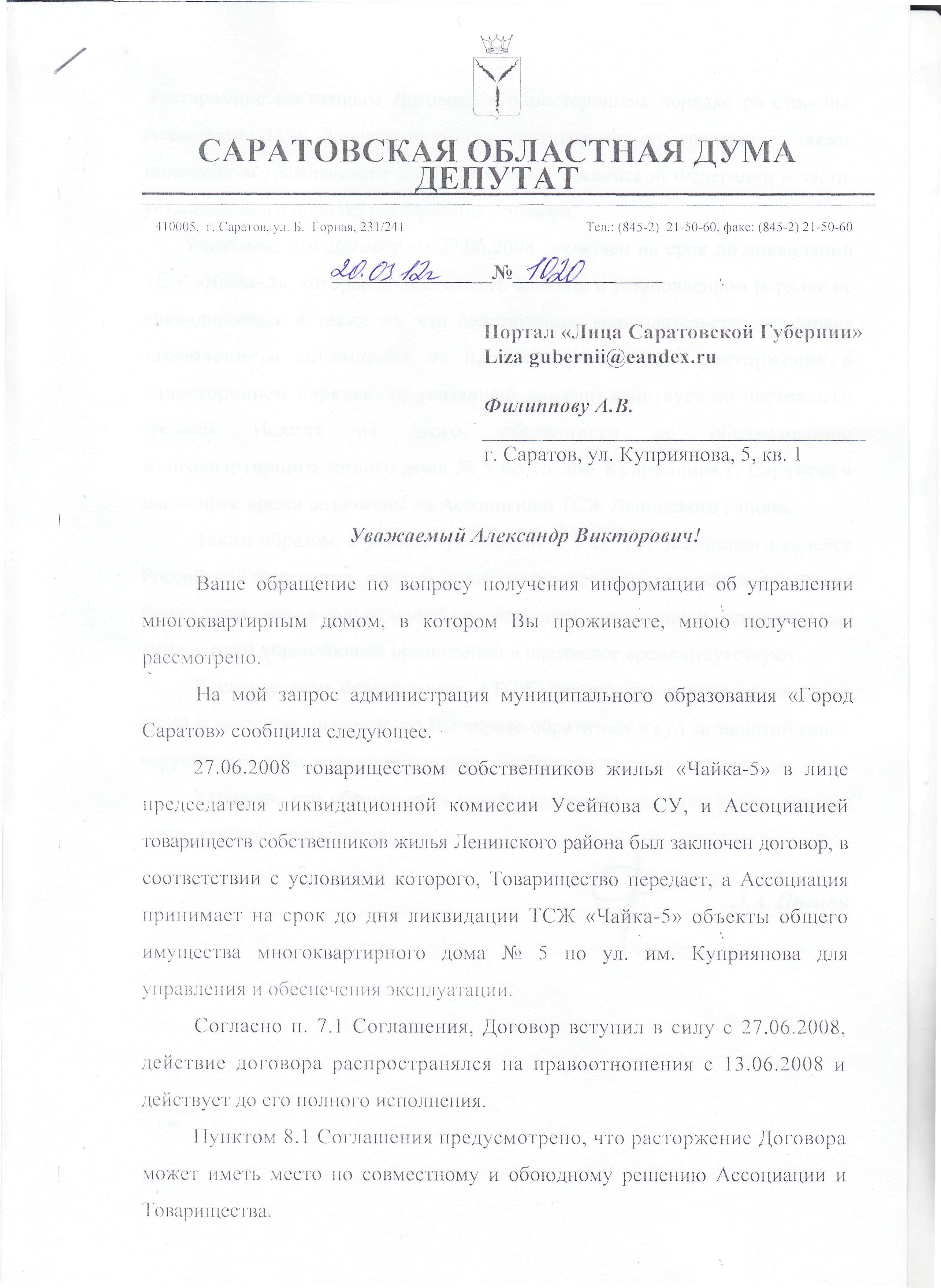 Уважаемый Леонид Александрович! Спасибо за желание разобраться в ситуации, которая сложилась на нашем доме благодаря многогодовым рейдерским атакам со стороны АТСЖ Ленинского р-на. Ответ, который мы, члены ТСЖ «Чайка 5», получили из прокуратуры области, вписывается в общую концепцию прикрытия незаконных действий АТСЖ. Мы писали, что с жителей дома с 2003 года взимают плату за капитальный ремонт без решения общего собрания и установления суммы платежей, а также без предоставления смет по выполненным и планирующимся работам. В ответе прокуратуры об этом нет ни слова. В проведении ревизии финансово-хозяйственной деятельности АТСЖ нам начальник отдела по надзору за соблюдением законов в сфере экономики и природоохранного законодательства Баринов А.В. ранее также отказал, в связи с чем мы обратились к Д.А. Медведеву за помощью в проведении такой ревизии. Леонид Александрович! Ответьте, пожайлуста, на вопрос: является ли АТСЖ Ленинского р-на управляющей организацией или нет? С уважением, члены ТСЖ. Ответ просим направить по адресу 410069 ул. Куприянова 5 кв.1 Филиппову Александру Викторовичу т. 36-69-05