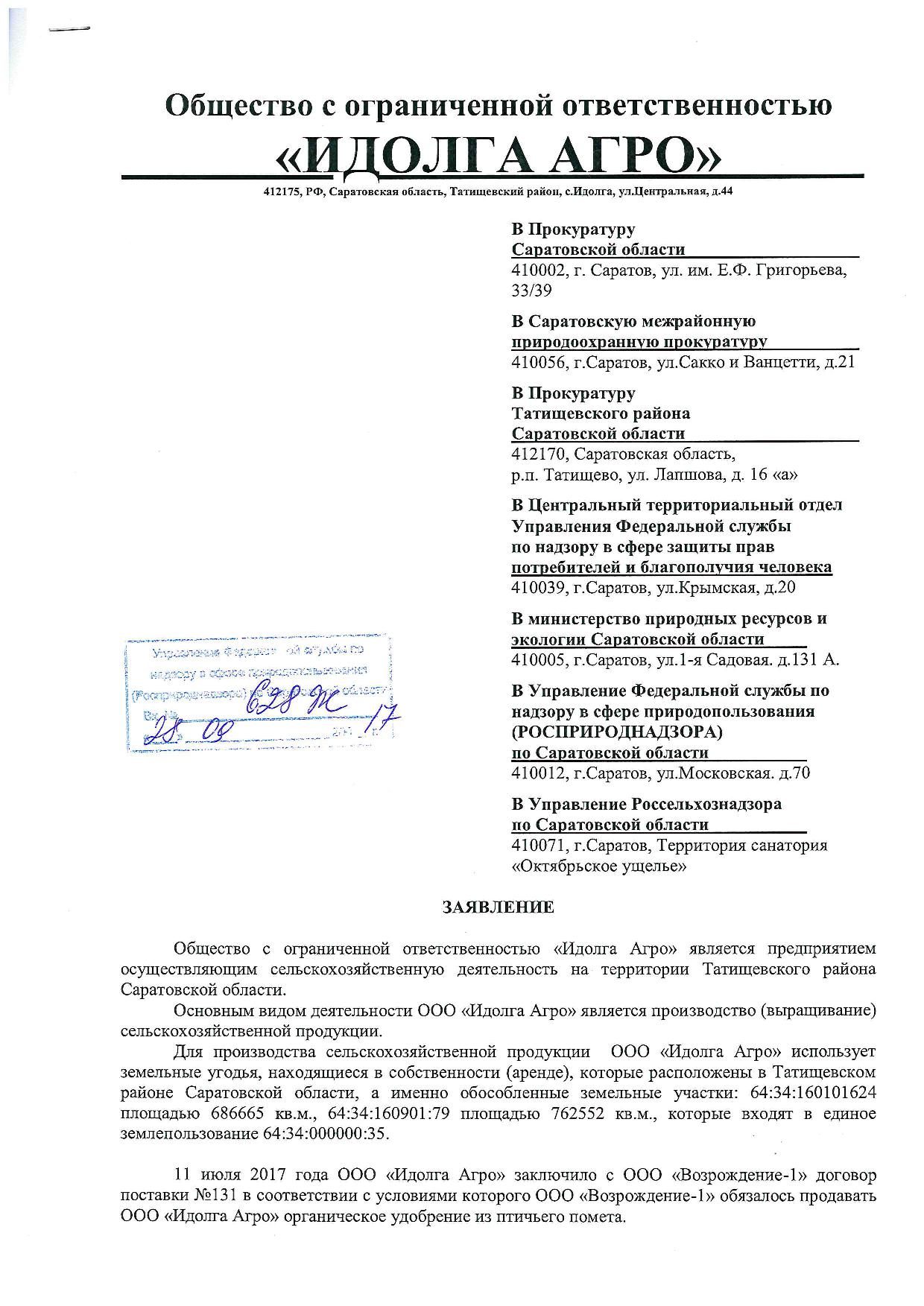 Учитывая вышеизложенное прошу незамедлительно пресечь противоправные действия и прекратить сброс куриного помета на земли сельхозназначения, используемые ООО «Идолга Агро», так как указанная ситуация не только причиняет существенный вред ООО «Идолга Агро», но и ведет к экологической катастрофе и возможности распространения разного рода болезней опасных для жизни и здоровья населения Саратовской области.
