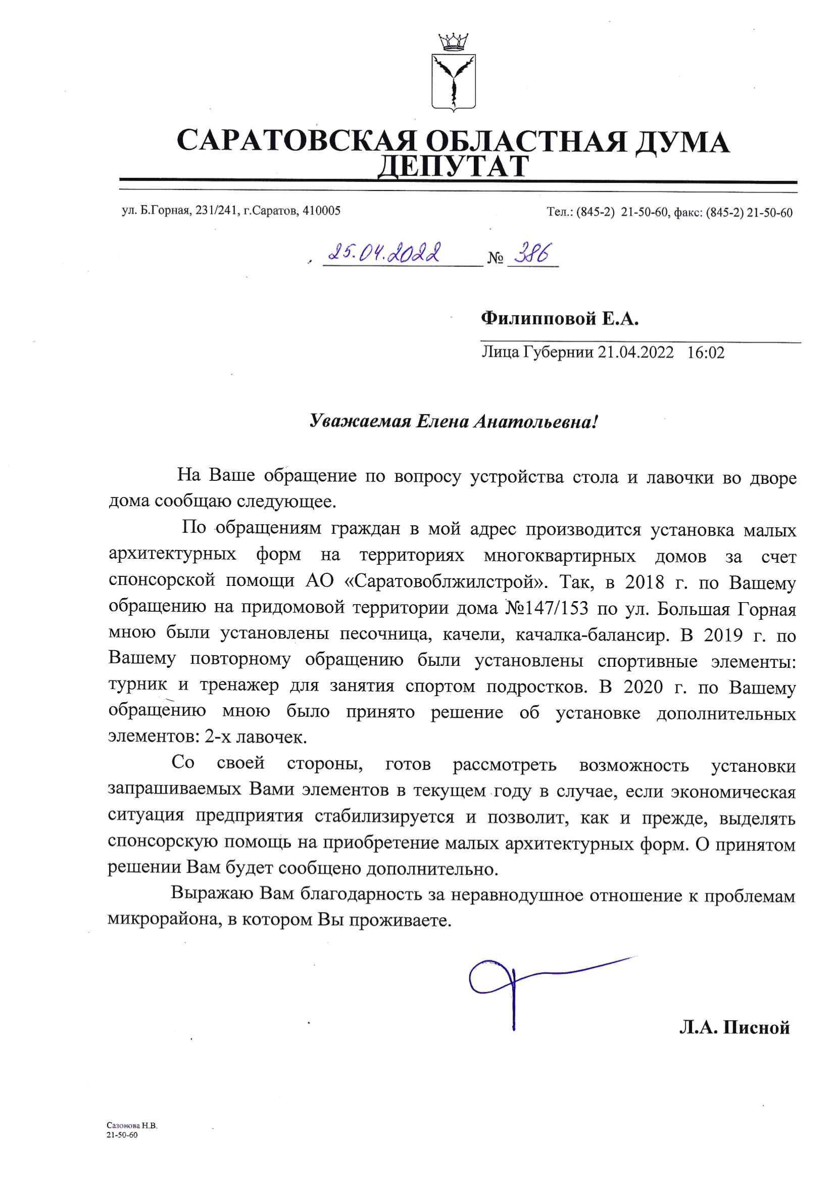 Здравствуйте уважаемый Леонид Александрович! Наш двор по адресу: город Саратов улица Большая Горная дом 147/153 благодарит Вас в оказании нам поддержки в облагоустроении двора! В прошлом году мы просили Вас помочь нам поставить нам хоть один столик с лавочкой, и привезти детям песочек, но в связи с пандемией Вы не смогли это сделать! Оочень Вас просим поспособствовать в этом нам в этом году! Спасибо Вам заранее! Всегда преданные Вам жильцы дома по ул. Большая Горная дом 147/153! Мой телефон +7 (927) 220-89-54 ; мой почтовый ящик ElenaFilippova1967@bk.ru