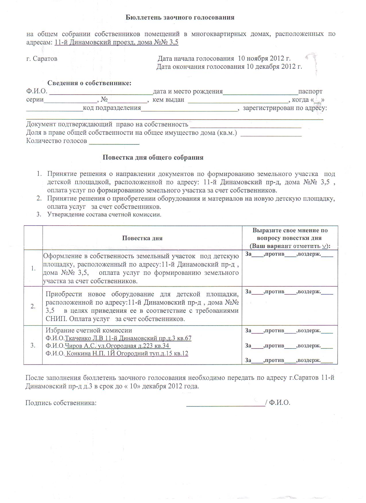 Добрый день, Леонид Александрович! Мы, жители 3 Жилучастка, уже слышали, что наш председатель ТСЖ "Престиж 56" находится под следствием за растрату средств ТСЖ на личные нужды. И что удивительно, опять пришла из ТСЖ интересная бумага - Бюллетень заочного голосования, в котором мы, собственники жилья, должны проголосовать за оформление в собственность земельного участка под детской площадкой, которая расположена у дома по 11 Динамовскому пр., 5, и разрешить им купить оборудование для этой же площадки. Кстати сказать, площадка в хорошем состоянии и в оборудовании не нуждается. Жители регулярно весной окрашивают инвентарь, убирают территорию и заносят своими руками песок, завезенный и высыпанный в стороне. Вот собственно и вопрос: Мы действительно должны покупать землю под площадкой и инвентарь, который не нужен на самом деле? Обращаемся к вам, так как Кошаева забаррикодировалась за металлической дверью и пройти к ней не представляется возможным. И потом, как вы прочтете из приложенного бюллетня, почему мы должны заочно голосовать за все это и за избрание счетной комиссии??? Думаю, что счетную комиссию мы должны знать лично, чтобы понимать, кто распоряжается нашими деньгами и иметь возможность спросить у них, куда распределяются средства?
