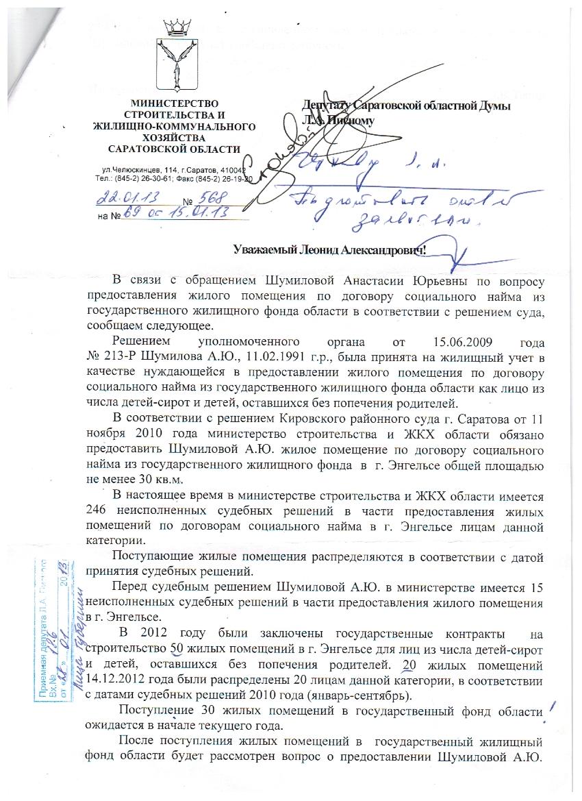 ЕЩЁ РАЗ Здравствуйте Ув,ЧИНОВНИКИ ПОМОГИТЕ ПРОШУ РАДИ СЫНА И ВСЕХ ЭНГЕЛЬССКИХ СИРОТ ещё раз обращаюсь к вам с мольбой стоя на коленях.Я ОЧЕНЬ ХОЧУ ИМЕТЬ СВОЙ УГОЛОК ПОЖАЛУЙСТА НЕ ПИШИТЕ ПИСЕМ ЧТО В ЭНГЕЛЬСЕ НЕТ ЖИЛЬЯ Просто напишите когда оно будет я Устала поймите устала скиталась по улицам быть БОМЖИХОЙ мой сыночек просит вместе со мной пожалуйста помогите вчера смотрели новости на 1канале http://www.1tv.ru/news/other/219285 там показывали меня и моего сыночка посмотрите и поверите мне жить нам НЕГДЕ поймите НЕГДЕ -МЫ БОМЖИ Государство нас с интерната выгнала на улицу а ЭНГЕЛЬССКИЕ ВЛАСТИ меня видеть не хотят ,Они наверное сейчас покупают подарки своим детишкам,а про таких как я сирот БЕЗДОМНЫХ им нет времени и думать !!!!! .Добрая женщина пустила нас,в комнату в общежитие,7кв,м у нас нет газа,гор,воды,но я молчала потому-что это лучше чем с ребёнком на улицу..ВСЕ Я ОЧЕНЬ ДОЛГО терпела,а сейчас я просто не знаю что мне делать пожалуйста.умоляю.прошу.молю помогите скажите мне когда нибудь дадут хоть какой нибудь уголок с крышей над головой,Я устала,все мои сёстры тоже бомжуют,а в Энгельсе жилья нам не дают приставы молчат и гонят нас мы же из коррекционного интерната-а значит дураки.В ЭНГЕЛЬСЕ столько много жилья но неужели нет старых квартир мы согласны на любую лишь -бы не на улицу ПОМОГИТЕ, МНЕ очень плохо. и трудно жить,но ради своего сыночка я готова ползать перед всеми на коленях простите,помогите!! не дайте мне остаться на улице Шумилова Анастасия Юрьевна и Димочка-2годаг,Энгельс89172178399 89873605696 http://www.1tv.ru/news/other/219285